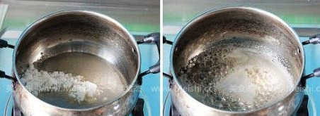 1:先把鍋刷干凈,在鍋里放入糖后,倒入30克冷水;將鍋用小火加熱。隨著熱度上升,糖會(huì)漸漸溶解,并開(kāi)始冒出小泡,加熱的過(guò)程中不需要攪拌,切記!