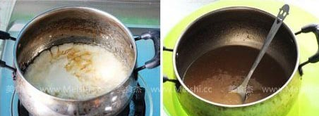 3:我們會(huì)慢慢的發(fā)現(xiàn),直到糖的顏色開(kāi)始改變,出現(xiàn)黃色時(shí),輕輕搖晃小鍋,讓糖的顏色變得均勻,保持小火加熱,直到糖的顏色越來(lái)越深,注意千萬(wàn)別把糖燒糊了。